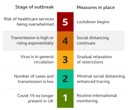 This worst case scenario gives us the highest alert level – level 5. Each level below has a threshold of certain measurements mentioned above, and specific guidelines and restrictions in line with the level, i.e. severity of the virus. The UK government then set a conditional plan to resume ‘semi-normal’ living conditions, based on the measurements being at specific thresholds over time.